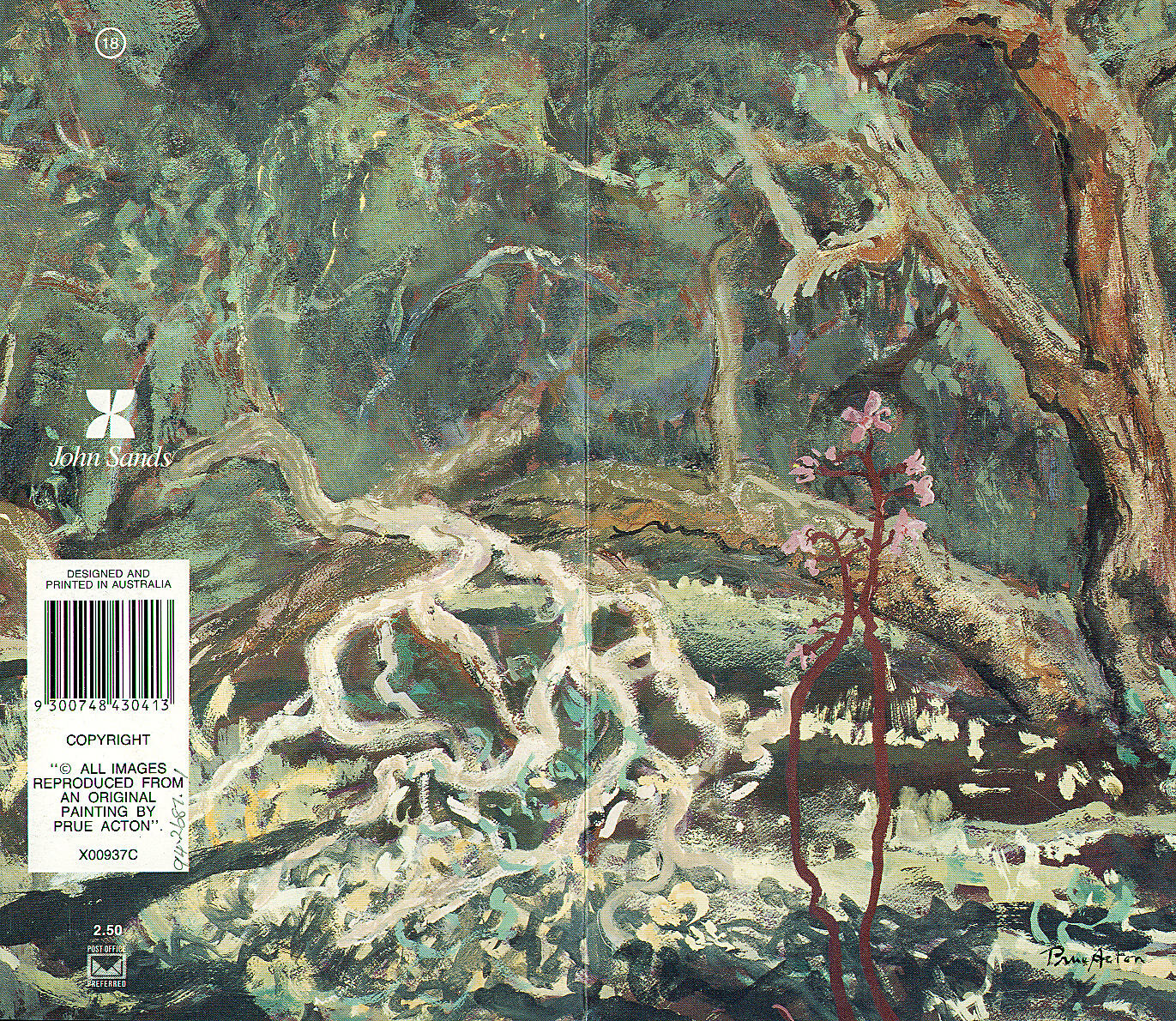 One of a set of eight Christmas and Greeting Cards manufactured by John Sands Ltd, 1992. The cards feature images of Australian Landscapes reproduced from paintings by Prue Acton. This card depicts a Hyacinth Orchid at Anglesea in Victoria. In 1881 John Sands Ltd, produced one of the first groups of commercial Christmas and New Year cards made in Australia.