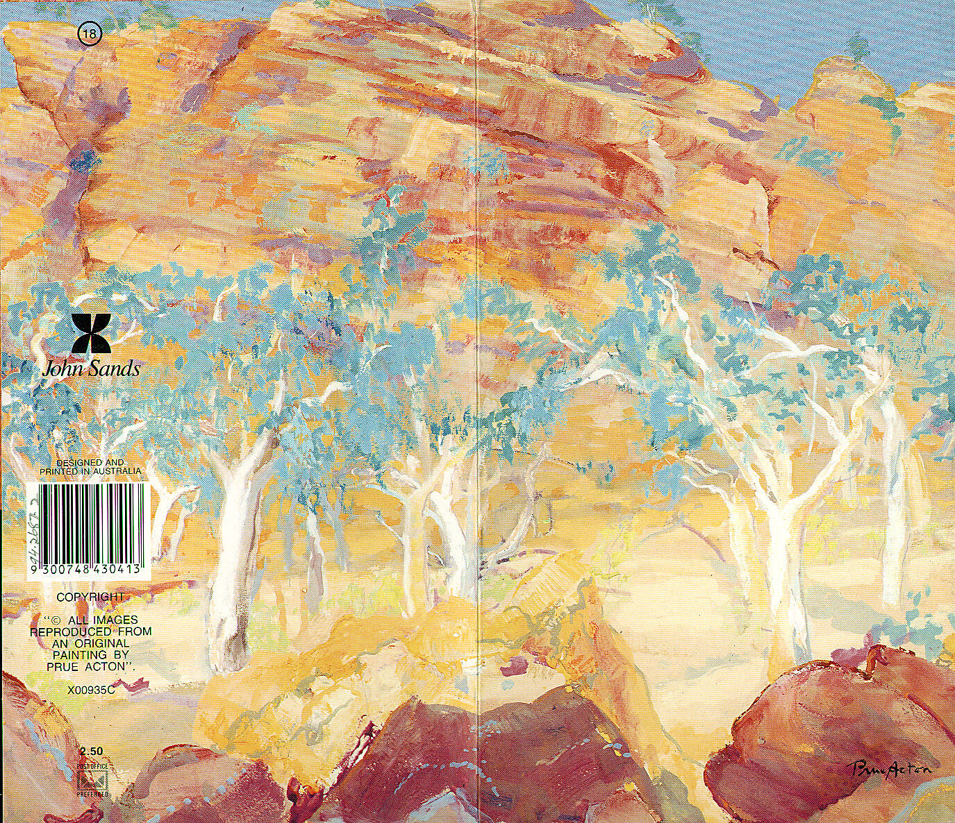 One of a set of eight Christmas and Greeting Cards manufactured by John Sands Ltd, 1992. The cards feature images of Australian Landscapes reproduced from paintings by Prue Acton. This card depicts Mootwingi in New South Wales. In 1881 John Sands Ltd, produced one of the first groups of commercial Christmas and New Year cards made in Australia.