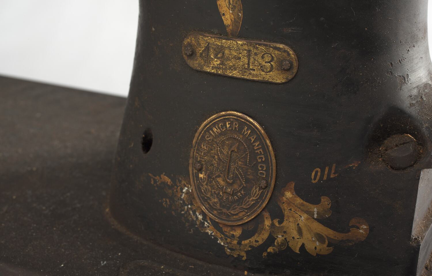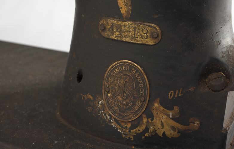 On machine: SINGER (painted in white on each side) oil (painted in white on top next to oil holes). On brass plaque: 44 - 13. Brass maker's plaque: SINGER MANUFACTURE