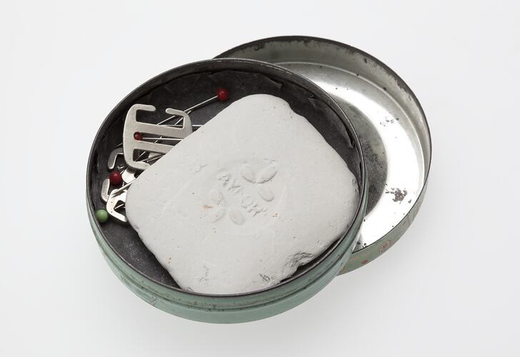 Steel dressmaker's pins used by Georgia Dereani, circa 1957. Georgia Dereani, her husband and infant son immigrated to Australia from Trieste, Italy, in 1955. They spent the first five years of their lives in Victoria at Bonegilla Migrant Camp. Georgina and her husband became staff members at Bonegilla and were allocated private accommodation, which Georgina went to great lengths to make comfortable, purchasing many household items around Albury, NSW. Georgia also loves to sew and crochet, and often made items for her house and her friends at Bonegilla.