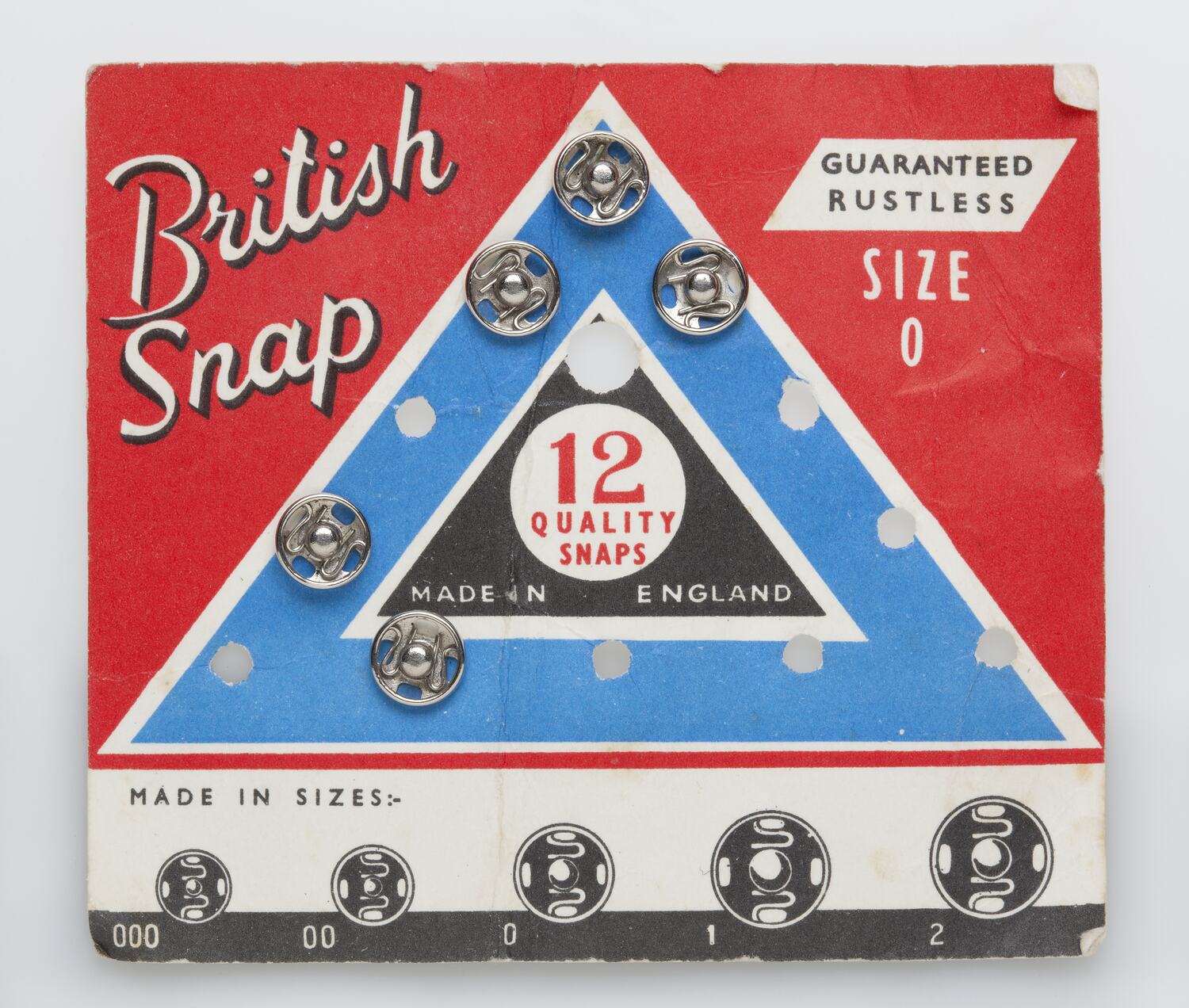 Set of 12 size 0 press studs on cardboard backing. Seven of the studs have been used.