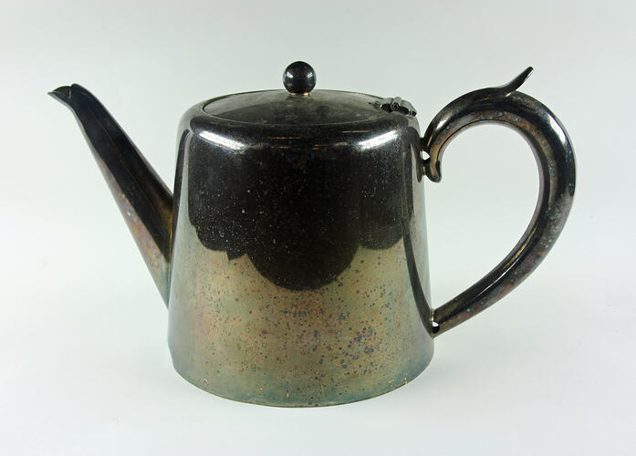 Large silver 'Paramount' plate teapot made in Melbourne by Luke Pty Ltd. The teapot was part of a tea set transferred from the Natural History Division of Museum of Victoria, and likely to have been used by staff.