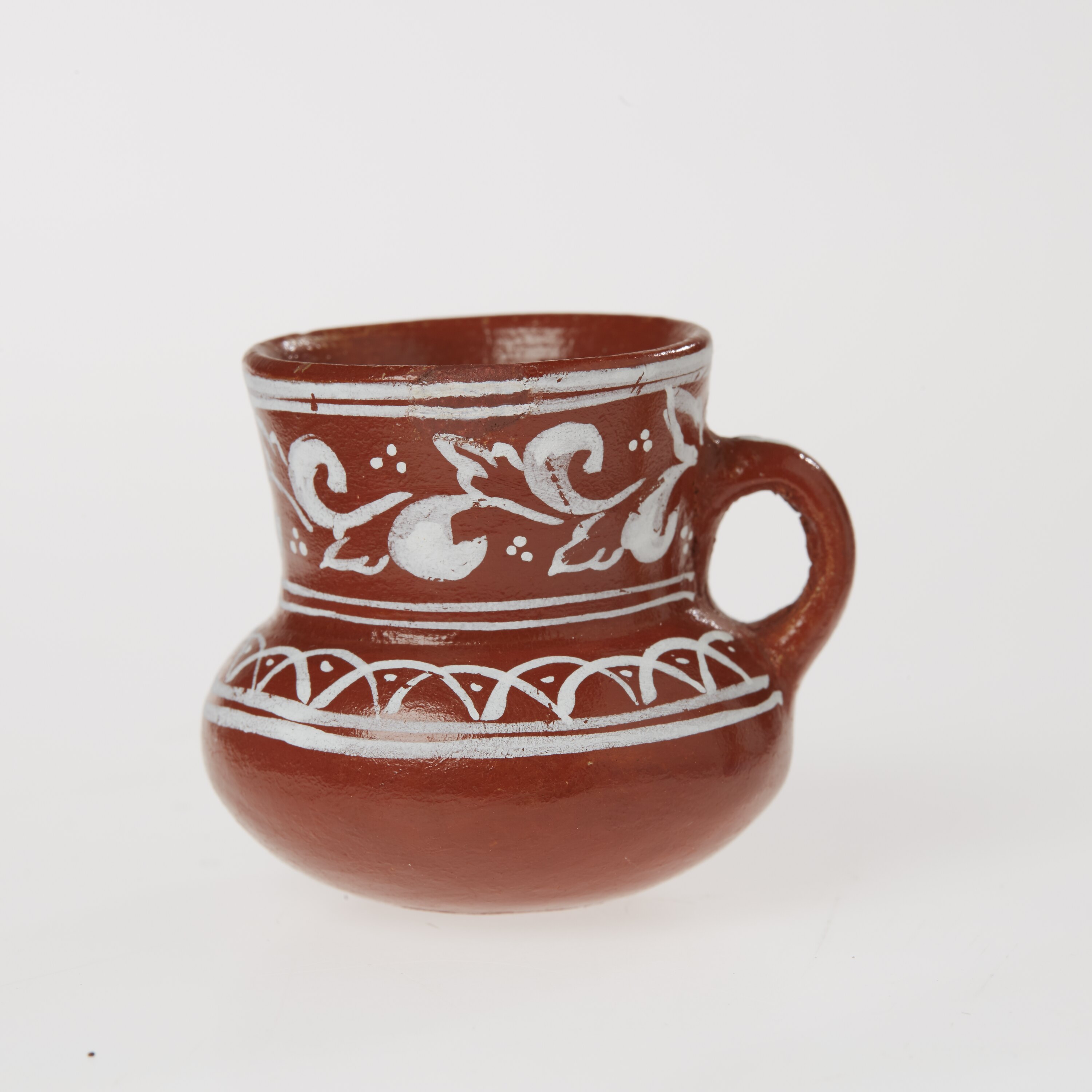 Urn from set of four miniature brown ceramic toy dishes with white pattern markings. Made by Senor Munoz, Senora Carmon Martiniano Munoz, Senor Martiniano (her father) & Pedro Munoz, aged 12, Tonala, Mexico, 1963. One of a group of toys made by members of the Munoz family in Tonala, Mexico. In this ancient 'pueblo', each home is a pottery factory where the families have made the same type of pottery for many generations. Dishes like these are also used by adults in social rituals among merchants on public market days in Mexico.