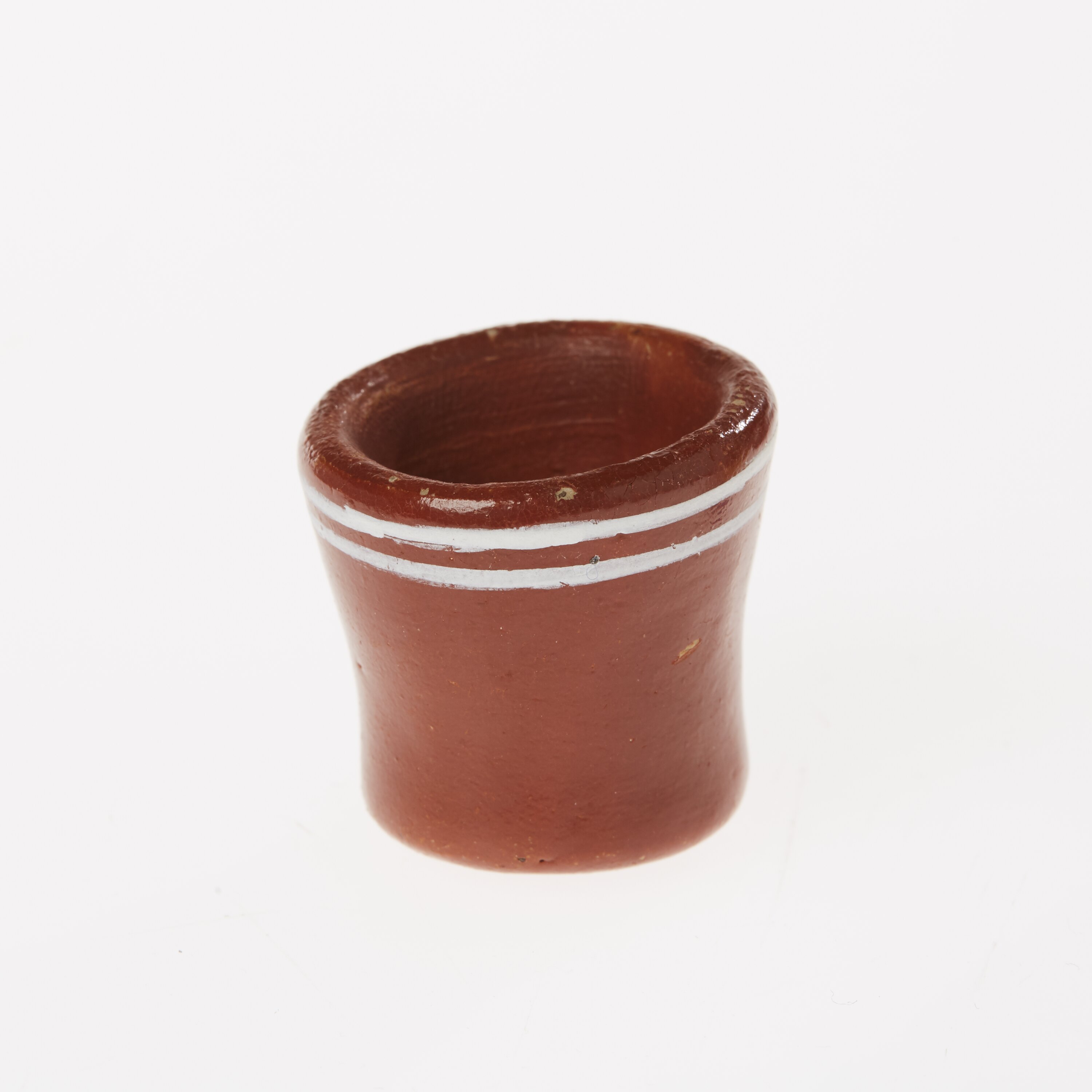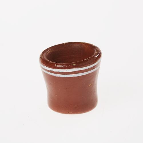 Mug from set of four miniature brown ceramic toy dishes with white pattern markings. Made by Senor Munoz, Senora Carmon Martiniano Munoz, Senor Martiniano (her father) & Pedro Munoz, aged 12, Tonala, Mexico, 1963. One of a group of toys made by members of the Munoz family in Tonala, Mexico. In this ancient 'pueblo', each home is a pottery factory where the families have made the same type of pottery for many generations. Dishes like these are also used by adults in social rituals among merchants on public market days in Mexico.