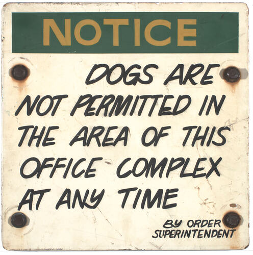 NOTICE/DOGS/ARE/ NOT PERMITTED IN/THE AREA OF THIS/OFFICE COMPLEX/AT ANY TIME/BY ORDER/ SUPERINTENDENT