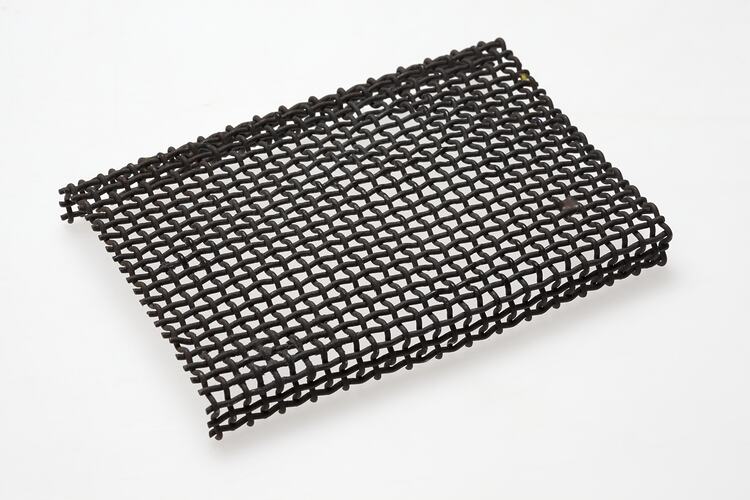 Mesh tray for use with a small kiln made by Fornell and Company, used by Martha Ash, circa 1996. Martha Ash was born in Poland in 1920 and lost all her family in the Holocaust. She came to Australia in 1949 where she studied ceramics, sculpture silver smithing, enamelling and glass mosaics. She usually worked without sketches or drawings and her work often reflected the images, colours and experiences of her environment and past. She died in September 1996.