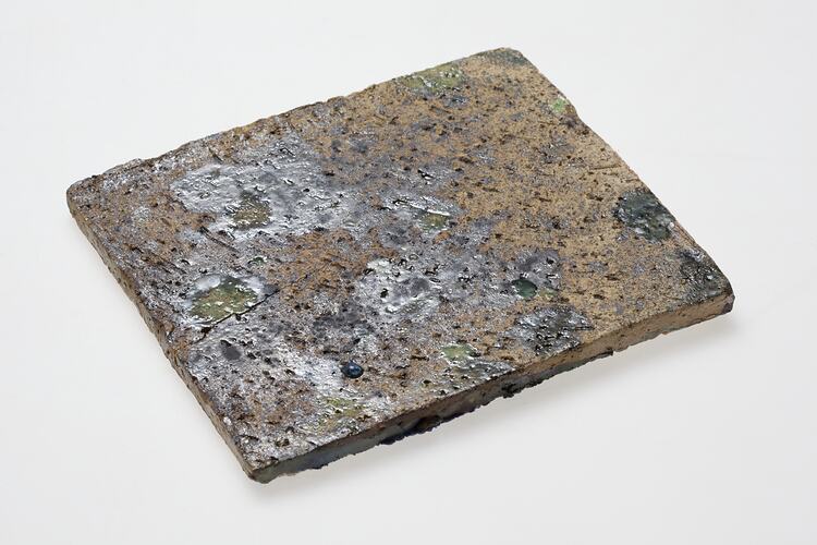 Ceramic tile for use with a small kiln made by Fornell and Company, used by Martha Ash, circa 1996. Martha Ash was born in Poland in 1920 and lost all her family in the Holocaust. She came to Australia in 1949 where she studied ceramics, sculpture silver smithing, enamelling and glass mosaics. She usually worked without sketches or drawings and her work often reflected the images, colours and experiences of her environment and past. She died in September 1996.