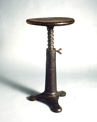 44 cm high plain cast-iron pedestal with three feet (no identification). 30 cm diameter circular wooden seat, adjustable in height by rotating screw-threaded seat stem in pedestal.