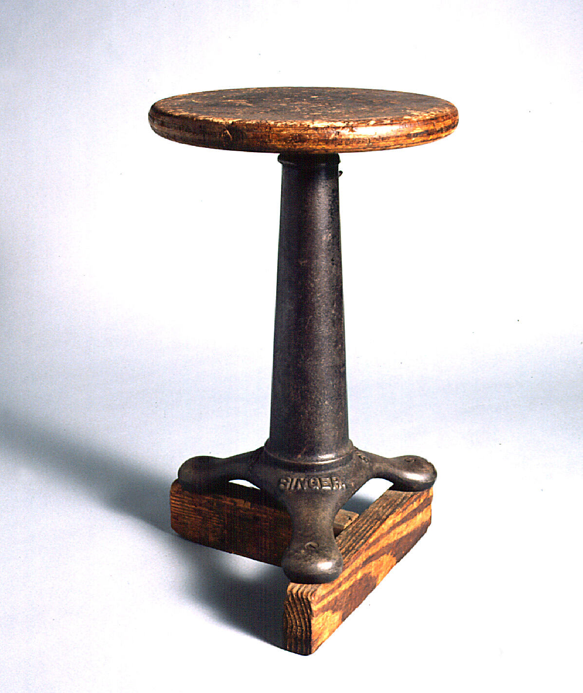 Adjustable stool on pedestal, with round wooden seat that screws to adjust the height. Manufactured by the Singer Sewing Machine Co, circa 1930s. Used at Simpson's Gloves Pty Ltd, Richmond, 1928-1988.