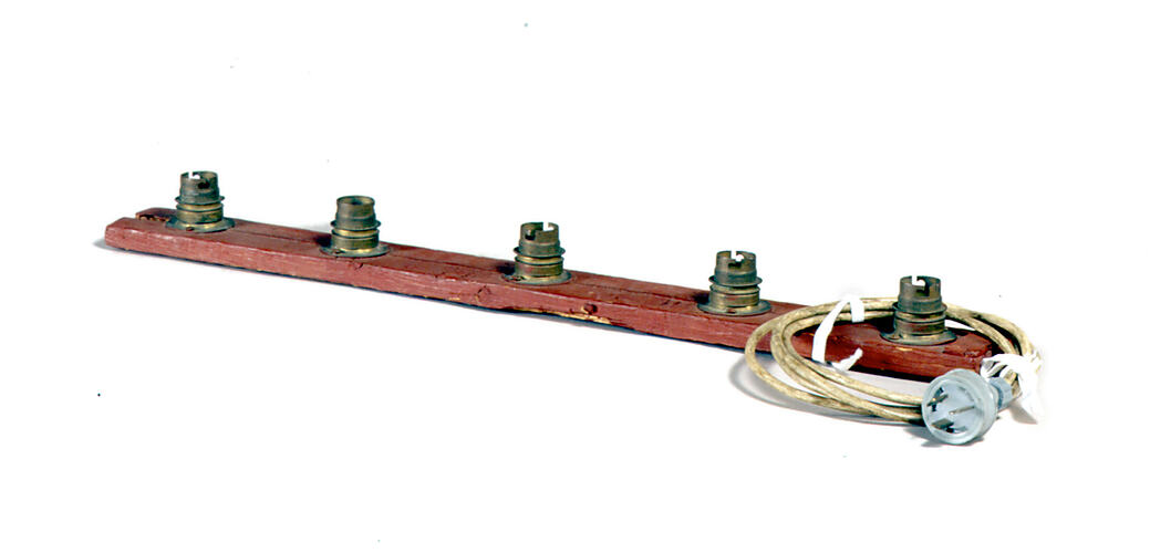 Wooden frame with light bulb sockets attached, it forms part of a set of lighting equipment, which was purchased in Melbourne around 1978 by Dimitri Katsoulis. This equipment comprised the stage lighting for performances of the Greek Shadow Puppet Theatre and was used by Dimitri in his performances in Victoria and in South Australia from 1978 to 1991. In order to perform shadow puppet theatre, it is essential to have an artificial light source.
