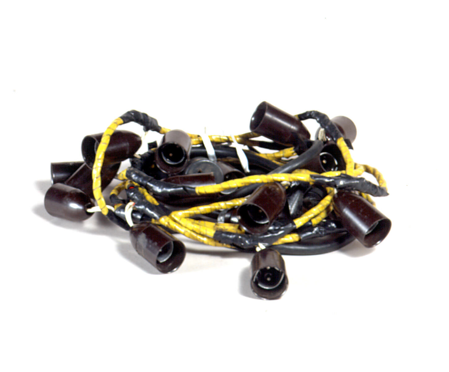 Light bulb sockets attached to a length of yellow electrical cable at regularly spaced intervals. Black tape has been wound around the cable in some places.