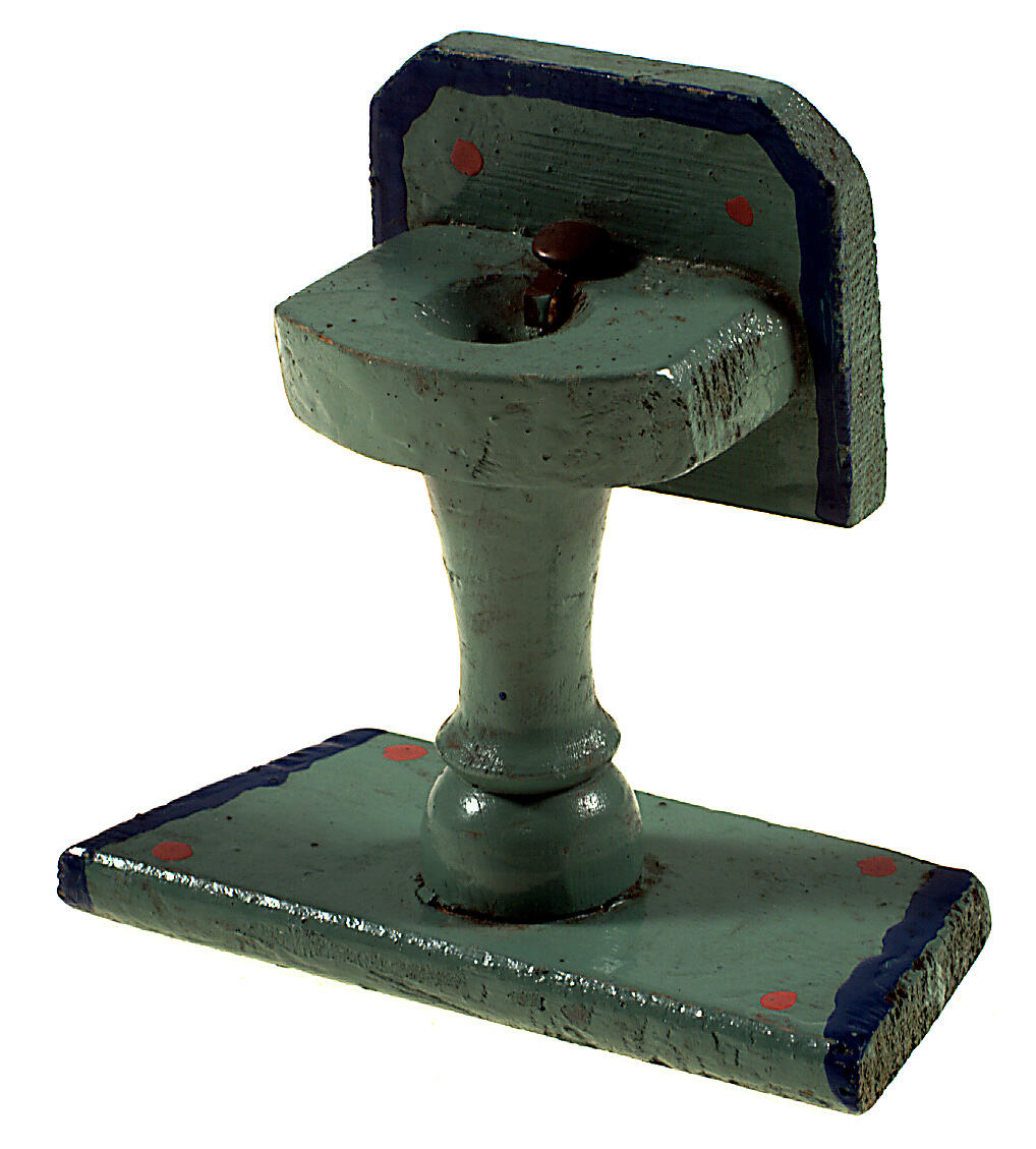 Crudely-formed wooden vanity basin, pedestal style, painted green, with backing pieces at basin at foot of toy, each trimmed with blue paint with red painted dots as highlights. The pedestal is made out of a tiny piece of turned wood. Brass split pin (?) in place of taps.