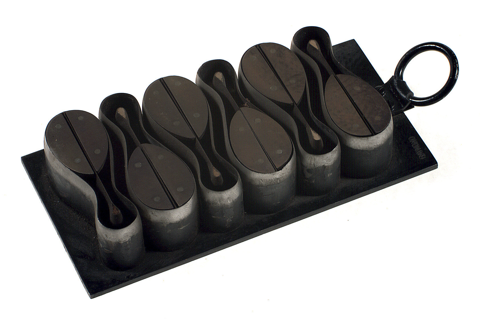 Press knife for cutting out gloves used at Simpson's Gloves Pty Ltd, Richmond. Plate for cutting 6 curved sections for trims.