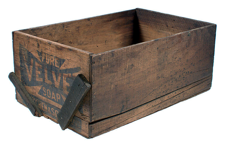Rectangular wooden box, roughly made, labelled 'Pure Velvet Soap'. Found in Simpson's Glove Factory, Richmond, when it was closing down in 1989, it is thought to date from the 1930s to 1940s.