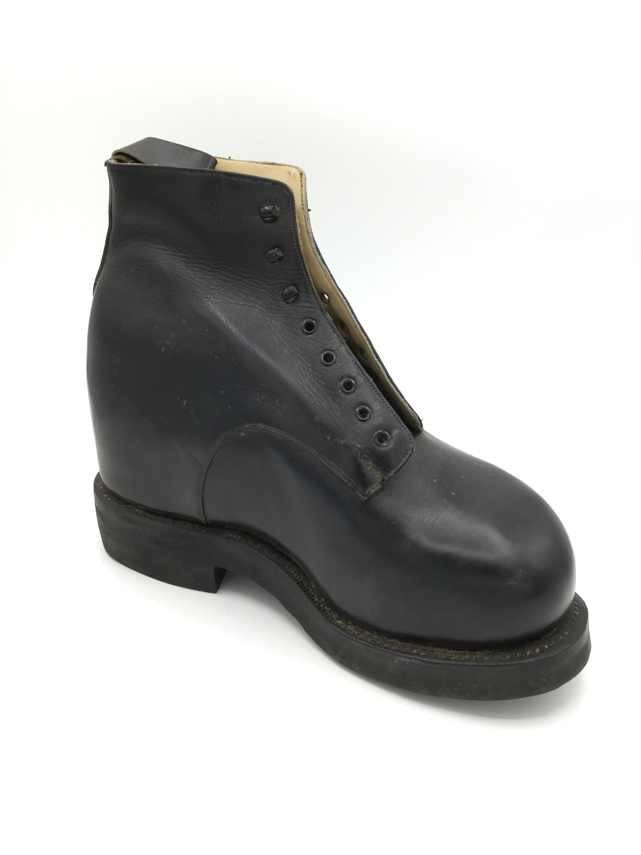 Pair of black leather boots. One is complete with a cork insole, no laces. The other is on a hand made silicon and sawdust last, partially constructed with the toe leather bent back over the last, no laces. The last has a long timber handle.