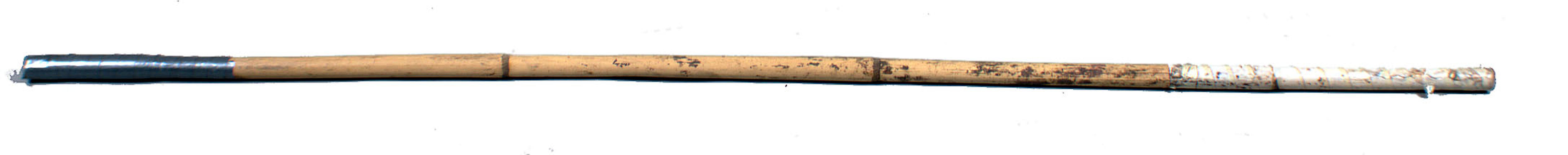 Long, narrow bamboo/cane stick (142cm) painted yellow with white tape at one end, silver nsulation tape at other end, possibly to stop stick splitting.