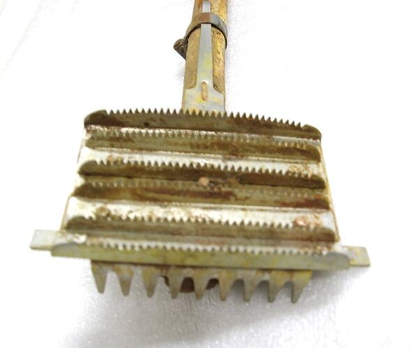 Stock curry comb affixed to long bamboo/cane handle (142cm) with a metal ring clasp. Used at Newmarket Saleyards.
