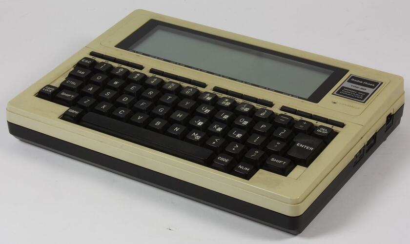 This portable computer is part of a collection of hardware, software, personal notes, trade literature and promotional material that was donated by their owner to Museum Victoria in 2003. He is representative of the generation that fully embraced computing when it became accessible economically but before general acceptance by the wider community. He used the TRS80 for his hobby in the 1980s. It was his first bought computer.