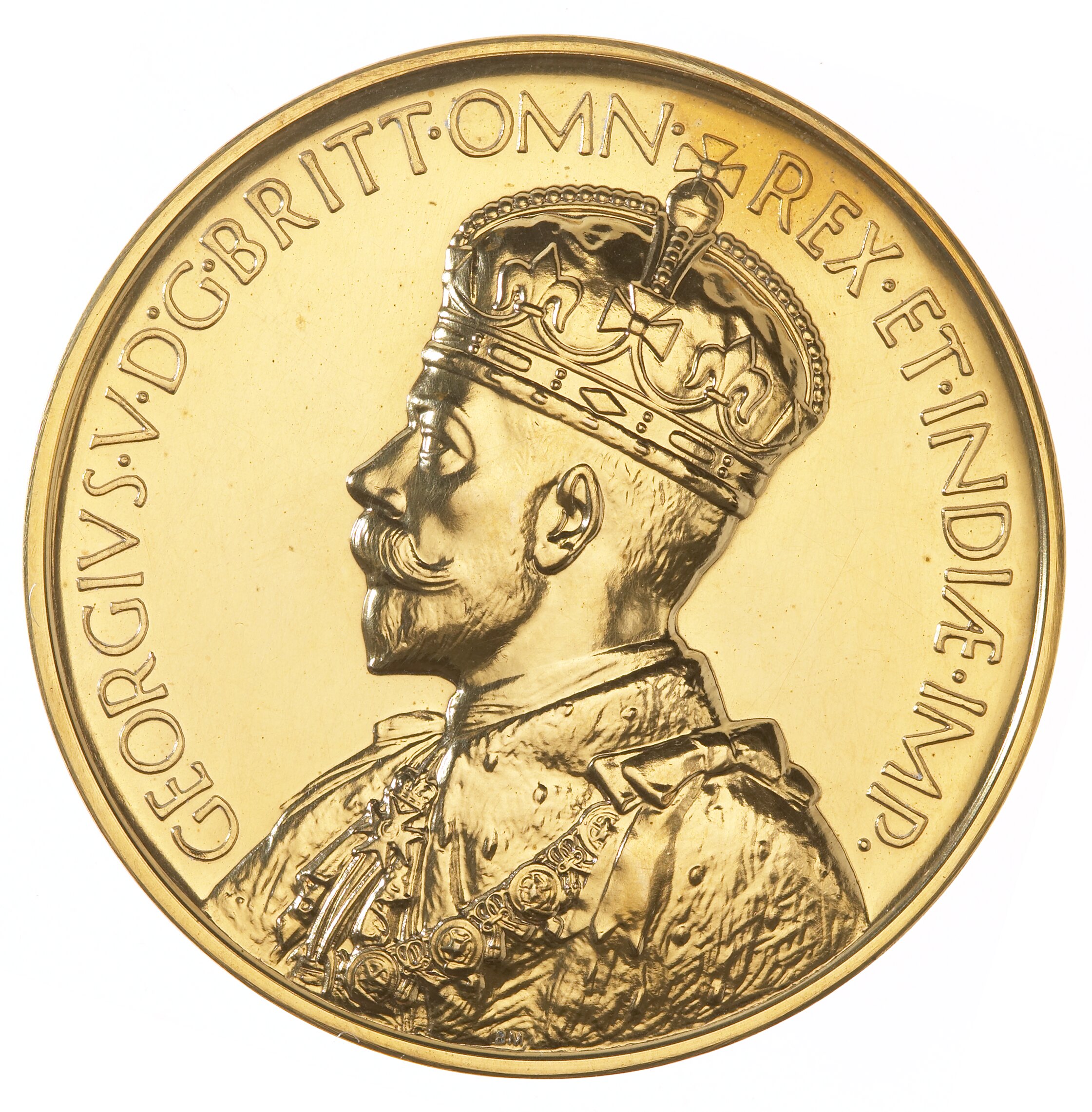 Bust of the King facing left, around, GEORGIVS . V . D.G. BRITT . OMN . REX . ET . INDIAE . IMP. ; in small letters on bust near rim, B.M.