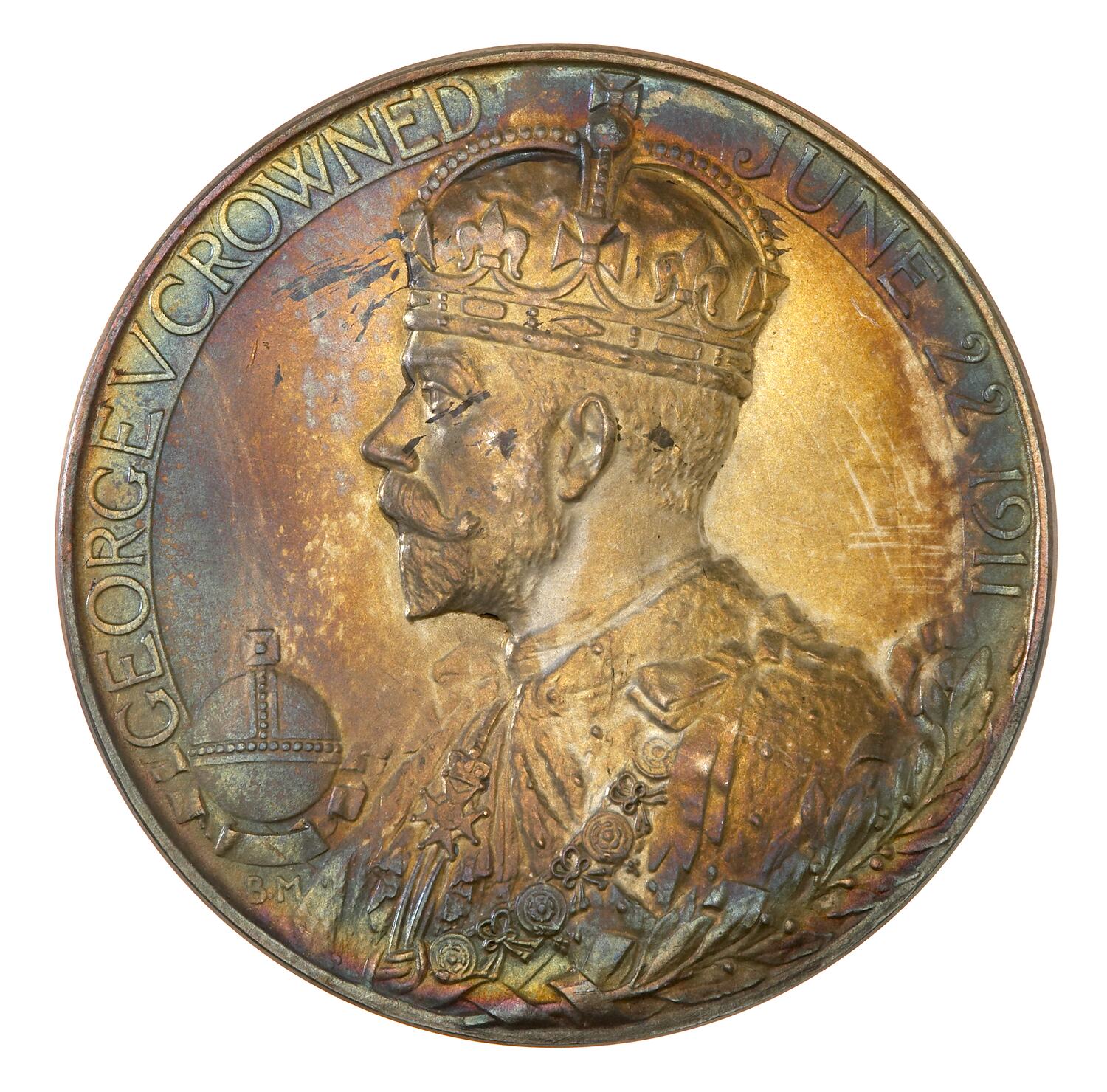 Crowned bust of the King facing left, around, GEORGE V CROWNED JUNE 22 1911. Before the king an orb, below which the artist's initials BM