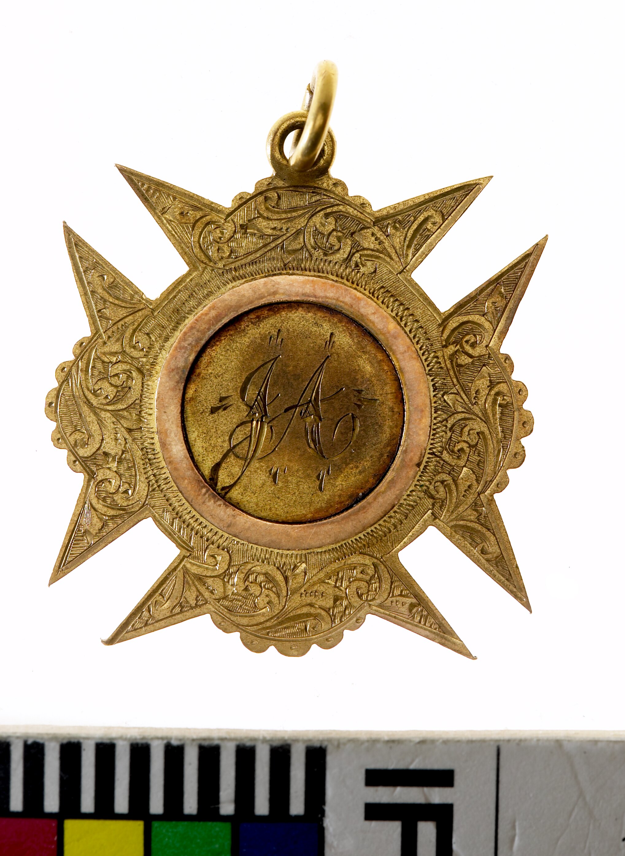 A gold cross shaped medal inscribed on the front with the winners initials and on the back with details.