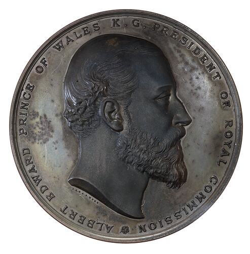 Head of Albert facing right, head bare; around, * ALBERT EDWARD PRINCE OF WALES K.G. PRESIDENT OF ROYAL COMMISSION and in tiny letters the artist's names J.S. & A.B. WYON