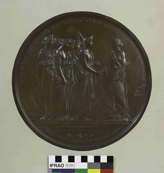 At right, the personification of Victoria, standing facing left and holding palm in left hand while receiving her "six sisters" who each bring a contribution; Behind Victoria is a Lion's head perhaps representing one of the lions that flanked the Museum (where the Exhibition was held). Behind the 'six sisters' an ancient ship's prow. Around above, the Latin FACIES NON OMNIBUS UNA NEC DIVERSA TAMEN QUALEM DECET ESSE SORORUM [translates as: "They all look different and yet alike : as sisters would"]. The exergue legend reads in three lines MEDAL AWARDED TO DR. MUELLER INTERCOLONIAL EXHIBITION VICTORIA 1866-7.