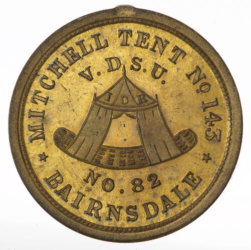 Obverse: MITCHELL TENT No. 143 V.D.S.U. NO. 82 BAIRNSDALE Reverse: TEMPERANCE FORTITUDE JUSTICE