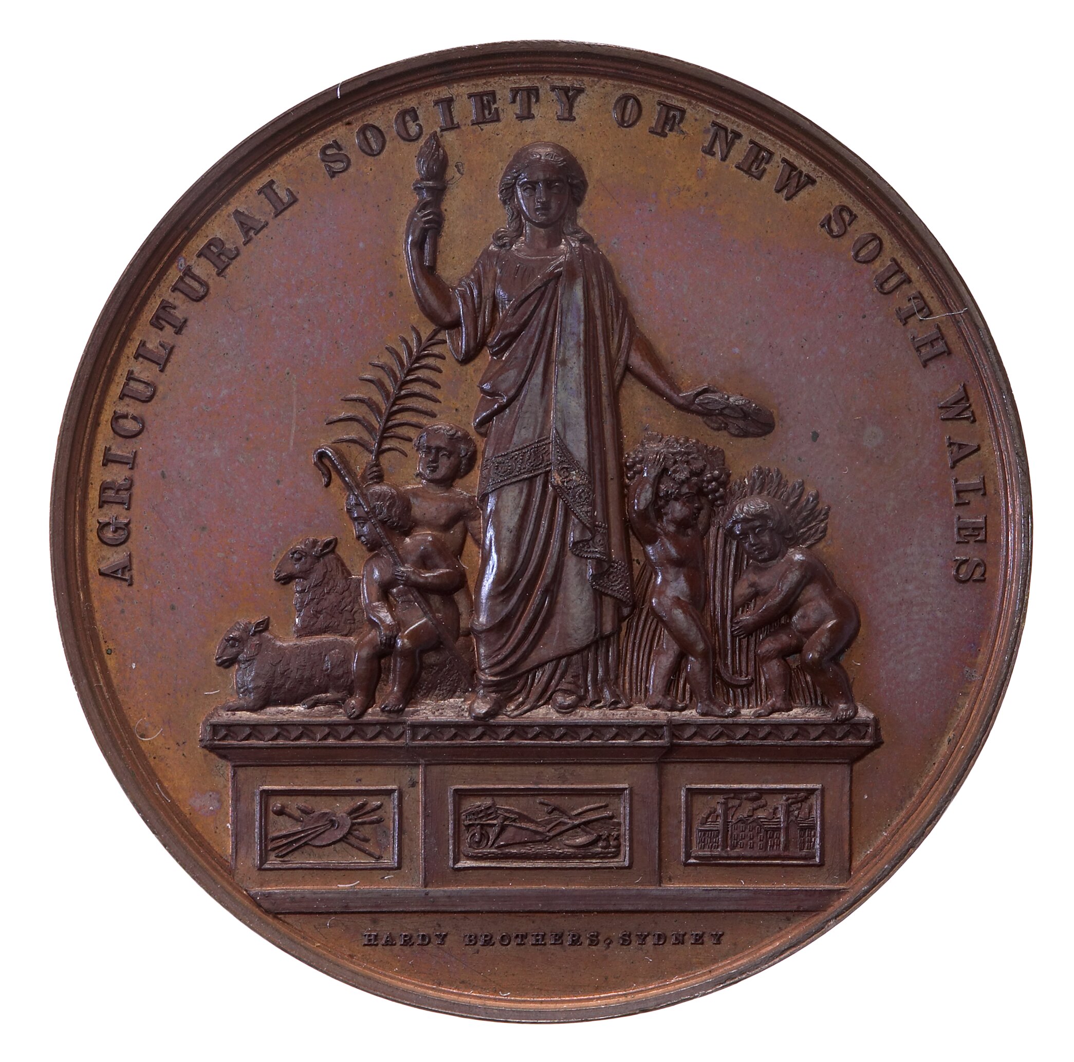 New South Wales, standing facing, holding a lit torch and a Victor's wreath, around her four children harvest wheat, carry grapes and; below on three panels art, agriculture and industry are representeed. tend sheep; around above, AGRICULTURAL SOCIETY OF NEW SOUTH WALES in small letter below HARDY BROTHERS LONDON & SYDNEY