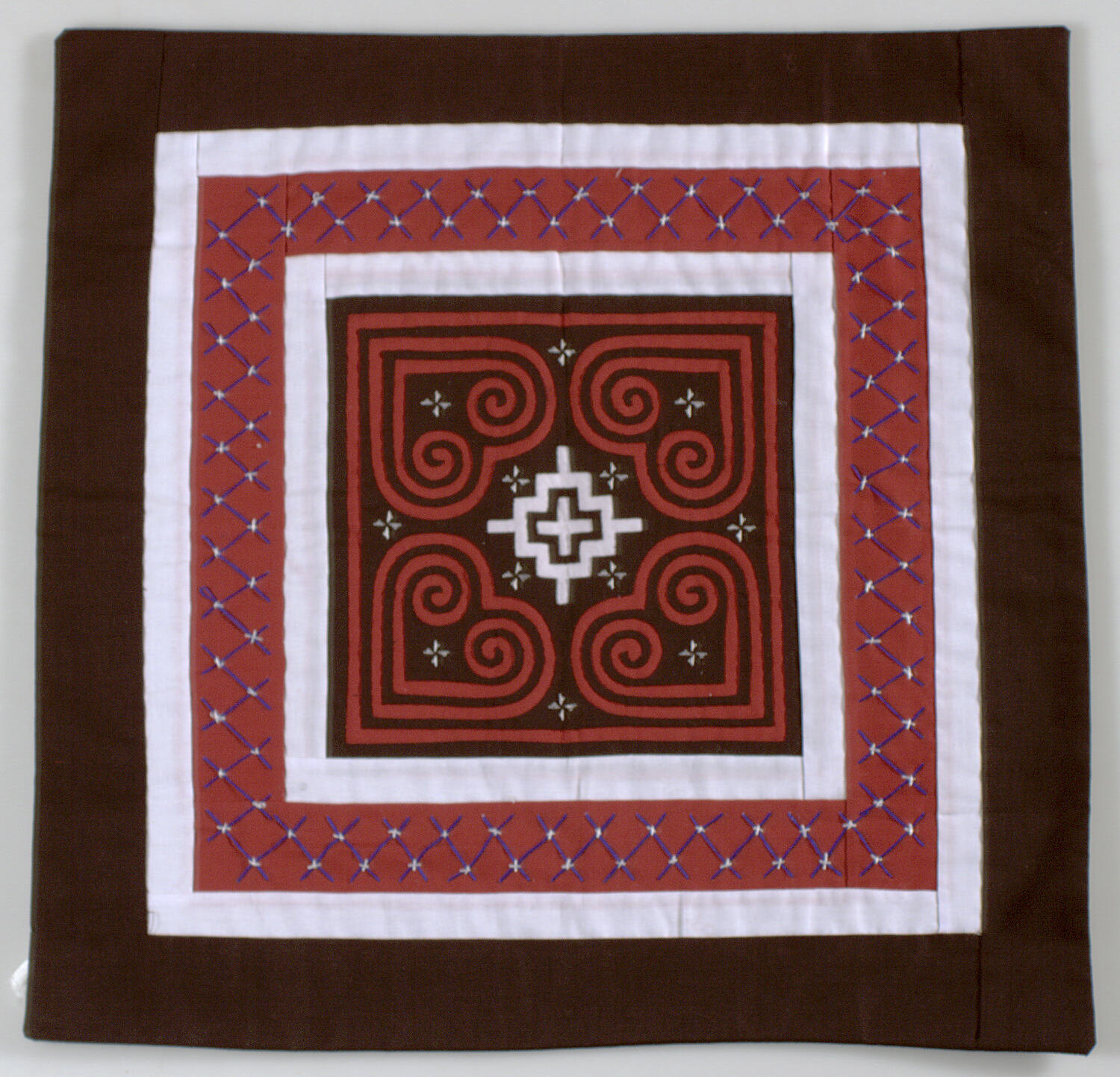Fine needlework has always been a source of great pride to Hmong women and girls are taught to sew at age seven or eight. The primary applique pattern is the Basic Heart Motif. The central motif is the Simple Cross with embroidered triangles completed in Satin Stitch as embellishments.