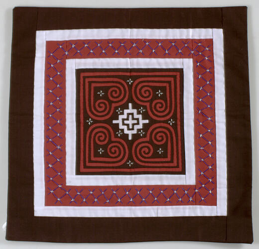 Cushion Covers made by members of the Hmong community in Victoria, circa 1991 - 1992. The Victorian Hmong community developed after many Hmong fled from Laos in 1975 and arrived in Australia in mid 1980s after spending time in Thai refugee camps. The women of the Victorian Hmong community produced and sold these types of works at the Fitzroy Craft Market to supplement family income.