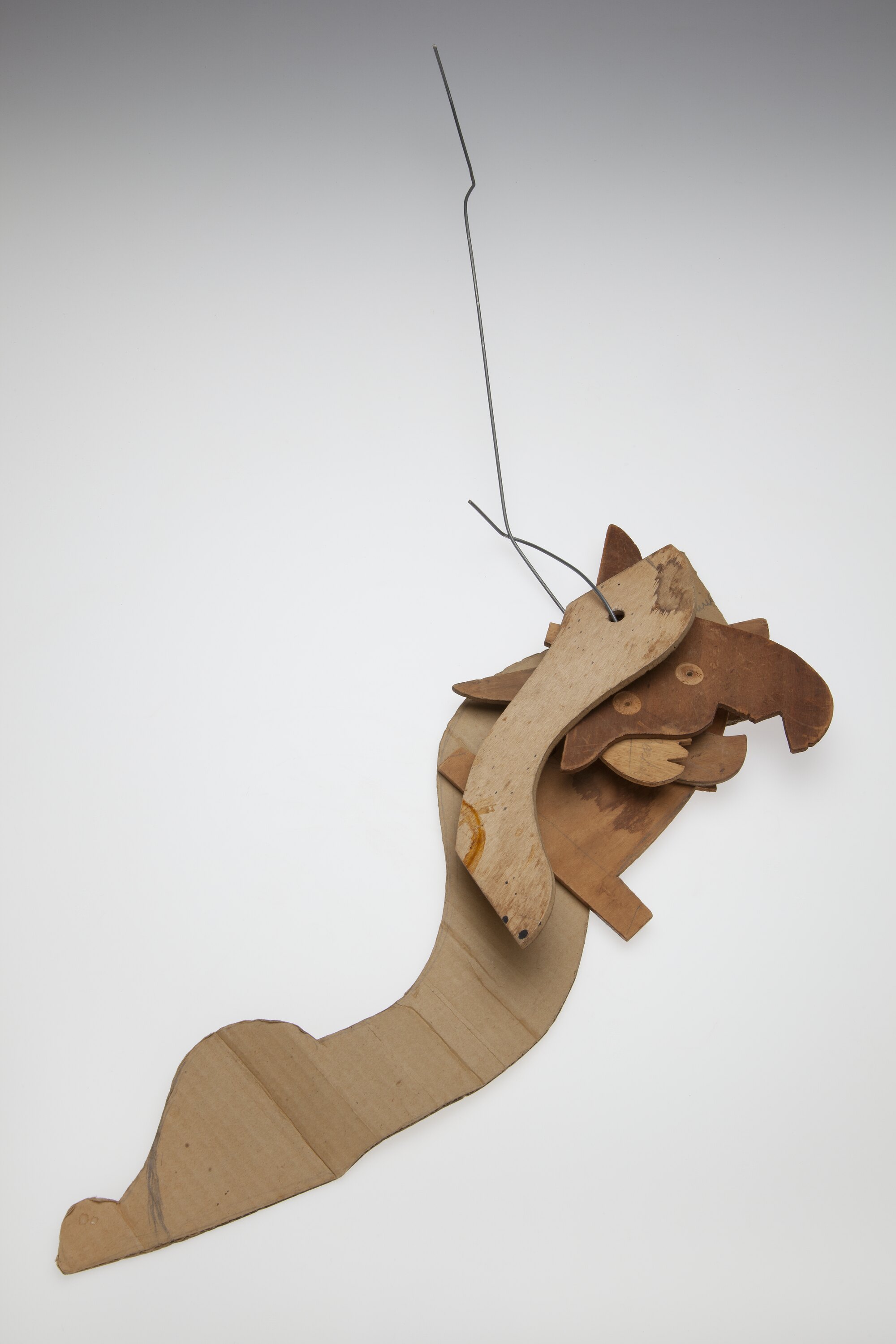 Templet Series of seven amorphous, curvy templates held together with a piece of hooked wire threaded through holes cut in their bodies. Some are made of a light gold- coloured balsa-wood. One template is made of cardboard. Measurements, instructions and shapes have been written in blue pen or lead pencil on the surface of several of the templates.
