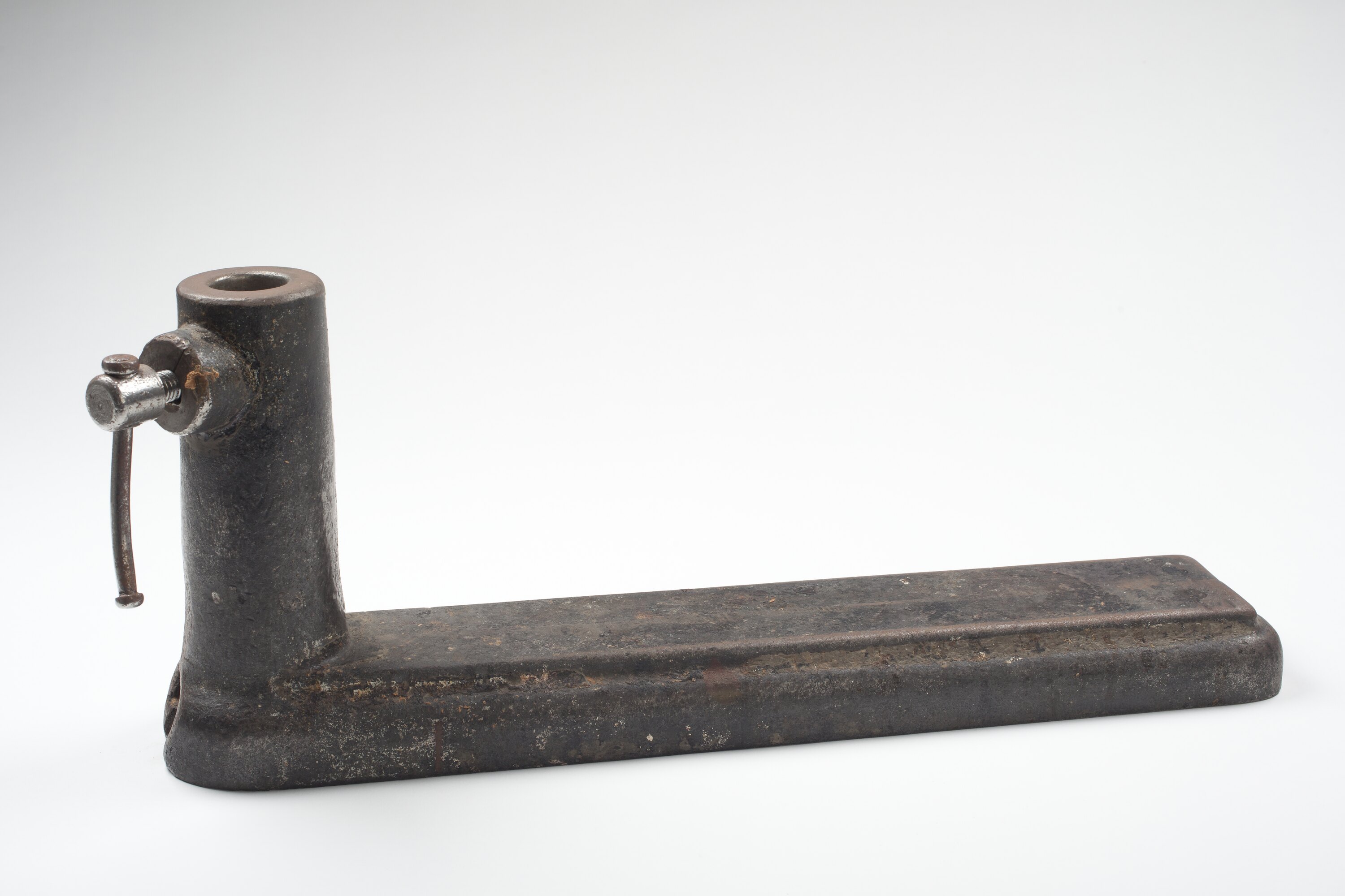 Tool Rest holder made circa 1910-1930. It was found inserted in lathe bench in gap of lathe bed, and was used to hold both tool rests and timber rests. It was taken from Area B1 at Adolph Bruhn & Son's Wood Turners Shop, 283 Coventry Street, South Melbourne. The business was established by Adolph Bruhn circa 1893 in Little Collins Street, Melbourne. Upon his death in 1919 it was then operated by Adolph's son Sophus Christopher Bruhn. Upon Sophus's death in 1959 his son Sophus Walter Bruhn took over the business. In 1970 Sophus reduced the scale of the business and relocated to South Melbourne. The business closed upon Sophus's death in January 1990.