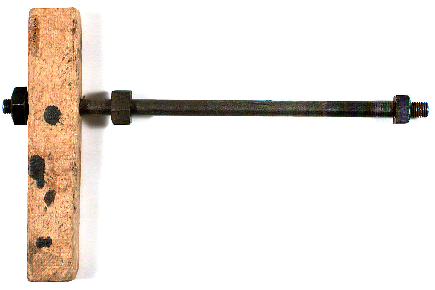 .1 L-shaped weight with a rimmed rectangular hollow along centre bottom of longer length, welded at 90 degree angle to round pole with a round hollow centre, which has a round protrusion on side near top with thread hole to hold tommy bar which is missing. Bottom end has wooden block inserted and held in place by loose hexagonal bolt and square bolt screwed to bottom end. Found in Area B2 in workshop, resting near lathe.