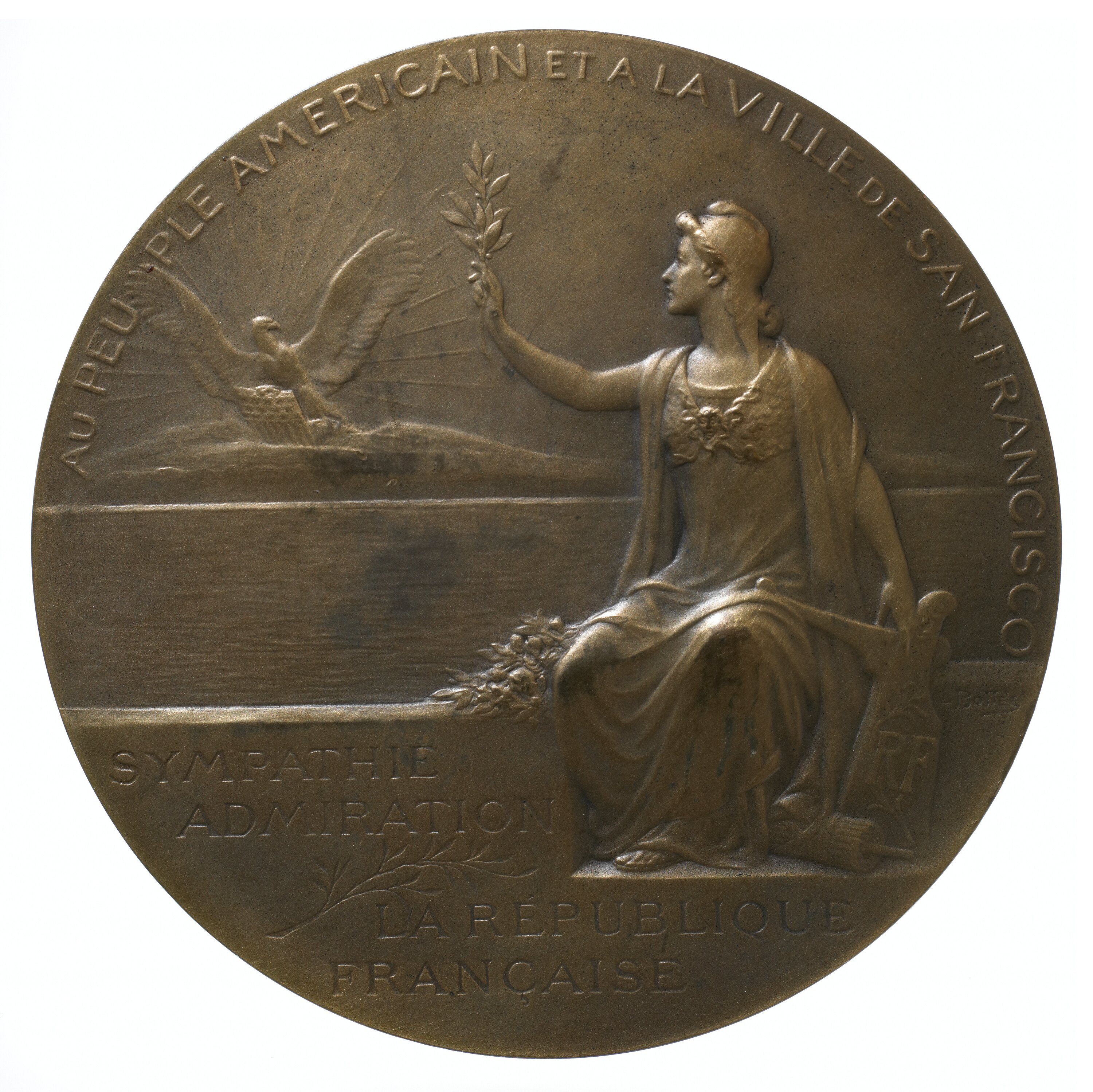 Female seated on sea wall, with a shield (?) inscribed RF. She extends an olive branch to a bald eagle holding a US shield, with the sun's rays behind eagle. Around, A PEUPLE AMERICAIN ET LA VILLE DE SAN FRANCISCO / SYMPATHIE / ADMIRATION / LA REPUBLlQUE / FRANCAISE.
