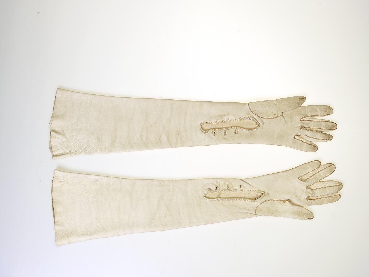 Elbow length cream kid leather glove, with three button holes but no buttons.