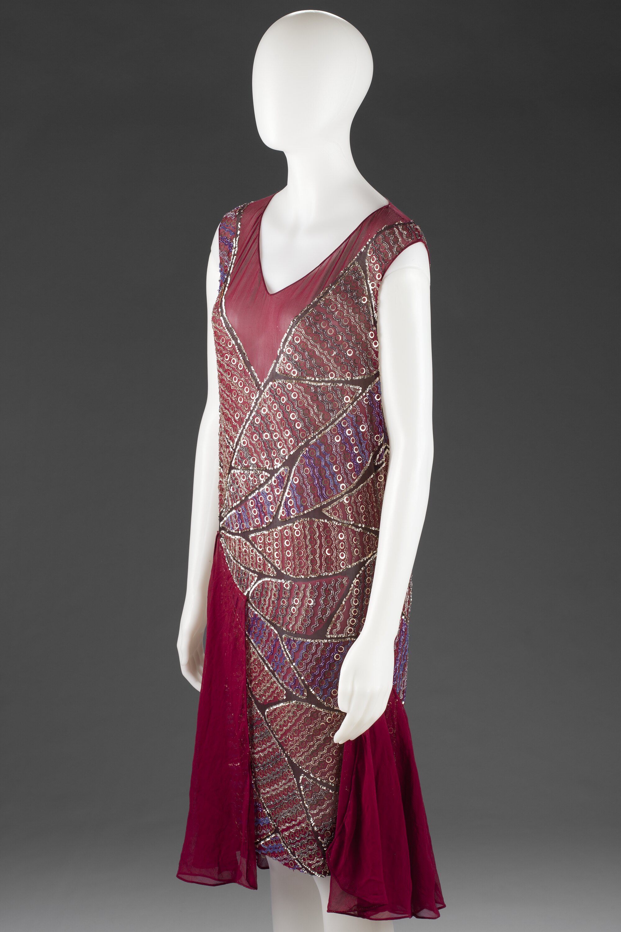 Crimson georgette dress with sequins and silver metallic rings, worn by Greek migrant Lili Sigalas in Melbourne in the 1920s. This 'flapper' dress is representative of this affluent social life and the taste for French couture which could be obtained in select Melbourne stores.