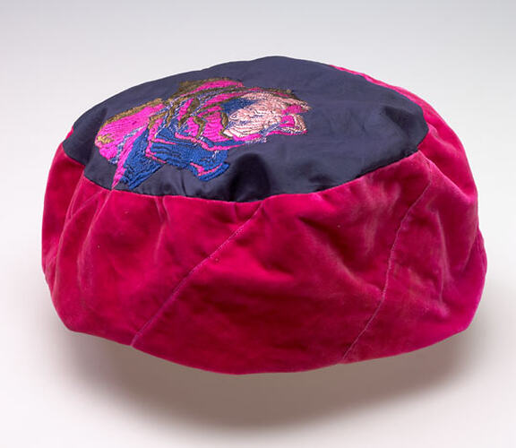 Circular, 'floppy' hat, made from dark pink velvet around the edge and a dark blue synthetic fabric on the top, which is embroidered in a rose design with dark pink, pale pink, blue and gold thread. Hat is lined with beige fabric. Circular wire inserted in rim.