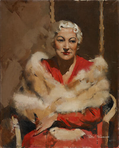 Oil painting of Lili Sigalas with a dark and light brown background. Lili is shown seated on a chair, wearing a red dress and a fur stole.