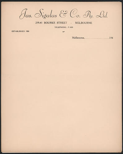 Inscribed at top: Jas. Sigalas & Co. Pty Ltd, 239-41 Bourke Street Melbourne / 194__' Established 1900