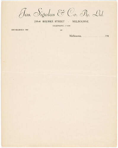 Inscribed at top: Jas. Sigalas & Co. Pty Ltd, 239-41 Bourke Street Melbourne / 194__' Established 1900