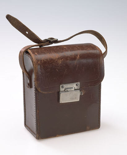 Brown leather rectangular case. There is a steel clasp on one side to close the opening flap in place. There is a leather strap, which can be adjusted using a buckle, across the top of the case.