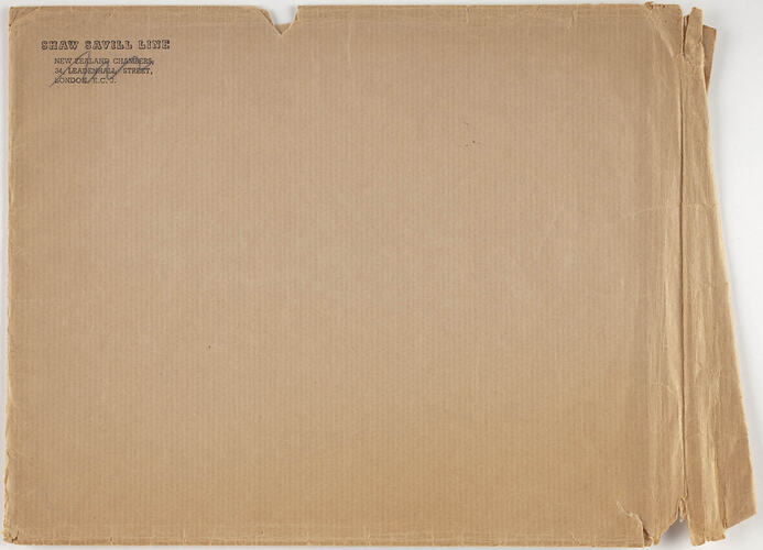 Envelope is plain brown and slightly torn around seal. On top left hand corner is the address of Shaw Savill office in London.
