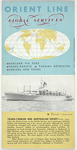 Folded double-sided Pamphlet for Orient Line ships Orcades, Oronsay, Orsova, Orion and Otranto. One side of pamphlet, fully opened out, shows a colour map of the world illustrating the destinations en route during a cruise. Reverse side has black and white photogrpahs of the ships, and information about the cruises available.