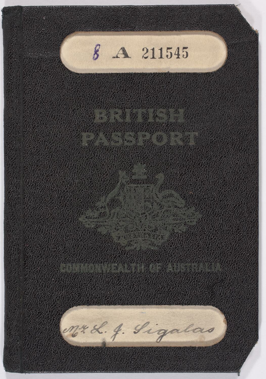 Front Cover: B A 211545 / BRITISH / PASSPORT / COMMONWEALTH OF AUSTRALIA / Mr L. J. Sigalas. There is extensive text, both printed and hand written, within the passport.