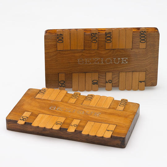 Score board for the game of Bezique, circa mid 19th century. It was brought to Australia by Lili Sigalas when she migrated to Australia in 1922 to marry Letho Sigalas. It was originally owned by Lili's mother and was a treasured family heirloom. Bezique, is a 19th century French melding and trick-taking card game for two players. It was developed in France from the game Piquet and gained its greatest popularity in Paris by 1860 and in England a few years later.