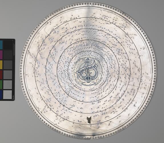 The disc was one of eight purchased by Museums Victoria in 1982 to supplement the 10 discs supplied with the symphonion when it was purchased by the Museum in 1930.