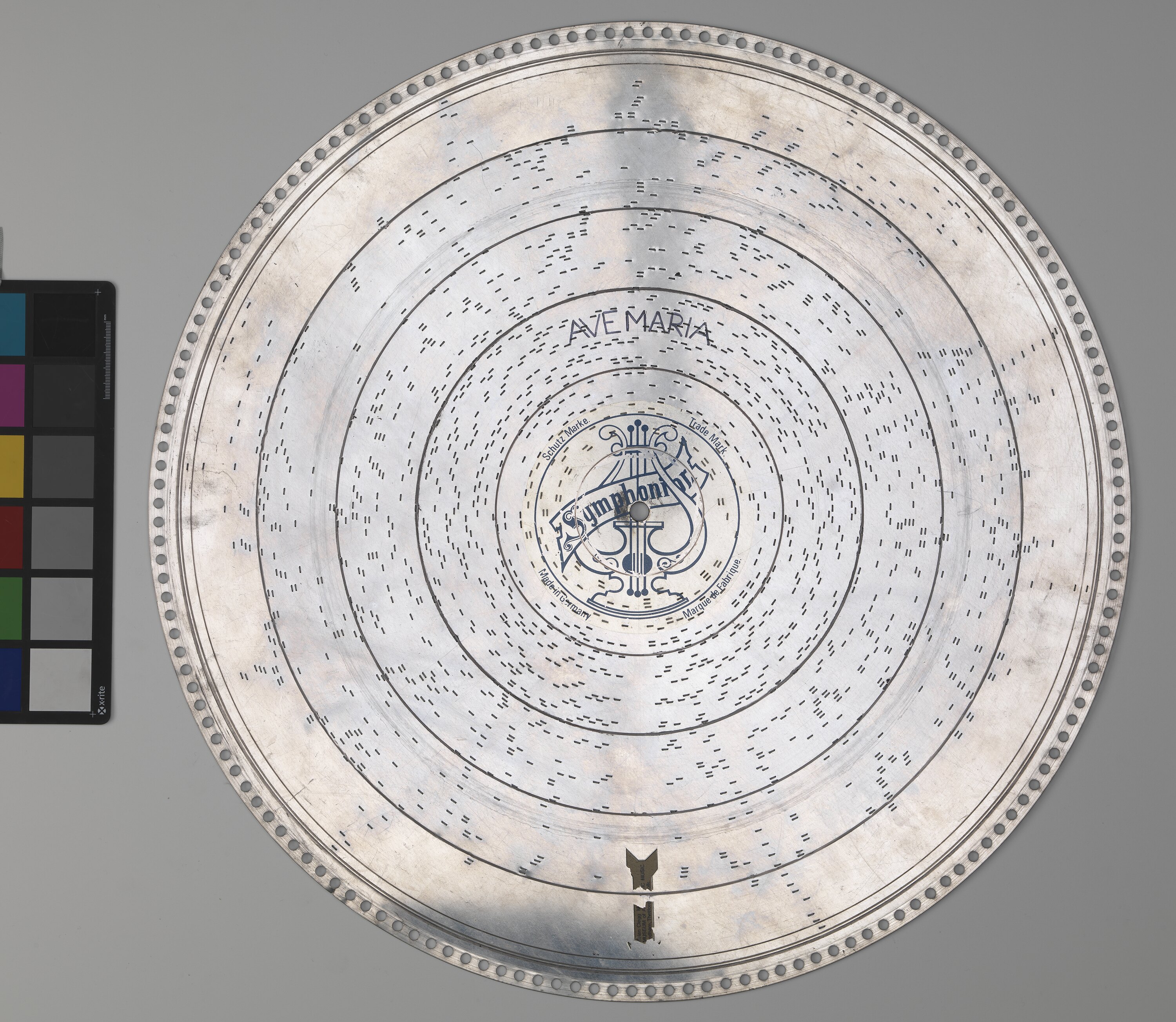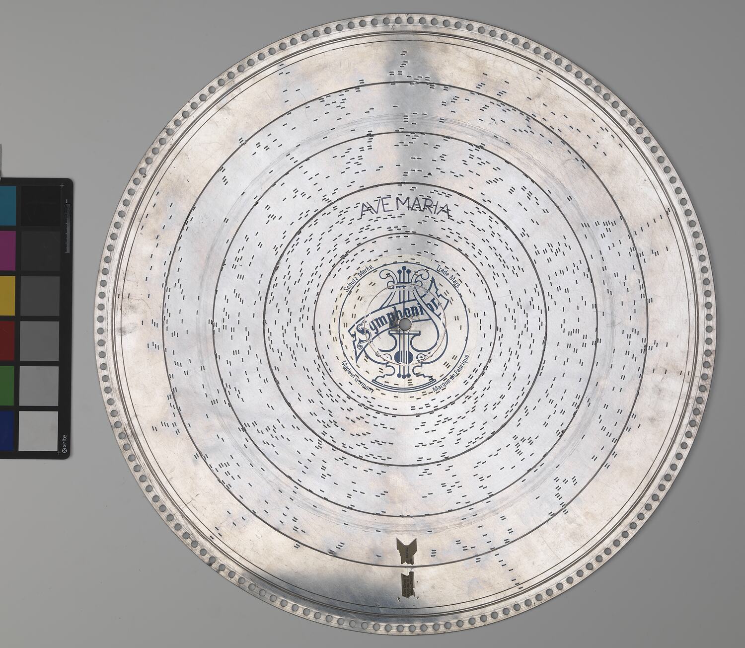Music disc for a symphonion, a mechanical music box. Tune played is 'Ave Maria'.