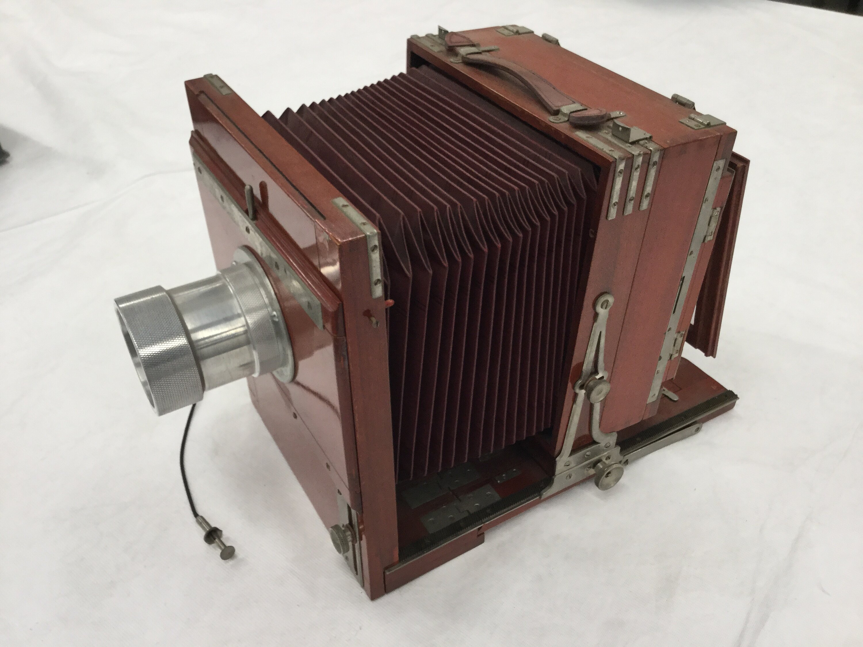 Photographic camera and tripod, about 1910. Comes with a leather case and several small accessories: 4 lens attachments in brown leather cases, 1 dark slide and 5 double dark slides. Camera manufactured by Curt Bentzin in Gorlitz, Germany. Lenses manufactured by Carl Zeiss in Jena, Germany. Used by Commonwealth Serum Laboratories (CSL) Ltd., Parkville, Victoria.