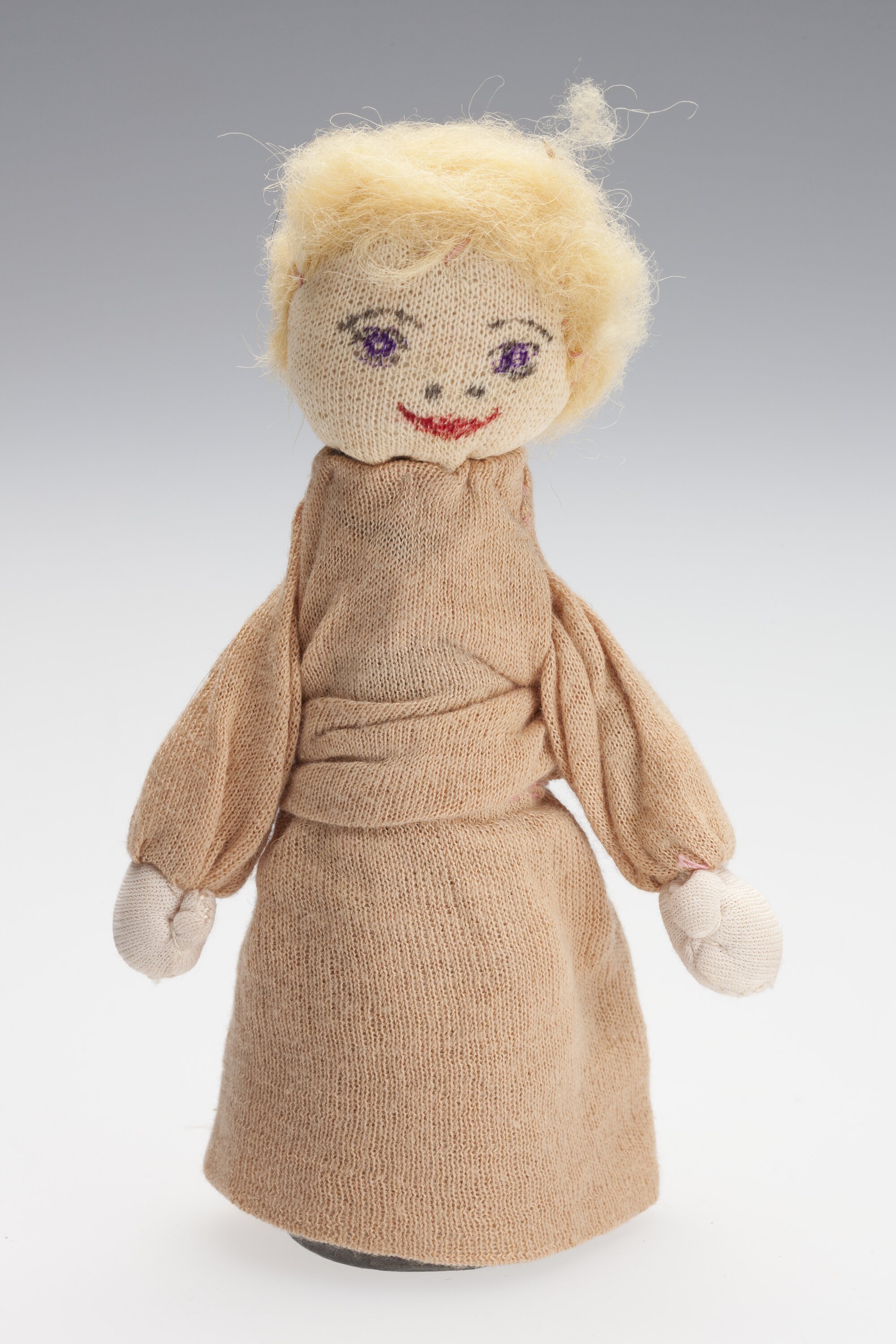 Doll with a cone shaped cotton body. The doll is dressed in a brown cotton dress, has yellow hair which has been sewn on and it's eyes, mouth and nose have been drawn on using, blue, red and black ink.